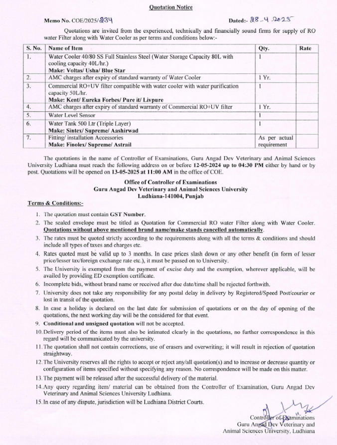 Quotation Notice for the supply of RO water Filter along with Water Cooler, O/o Controller of Examinations, Guru Angad Dev Veterinary and Animal Sciences University, Ludhiana