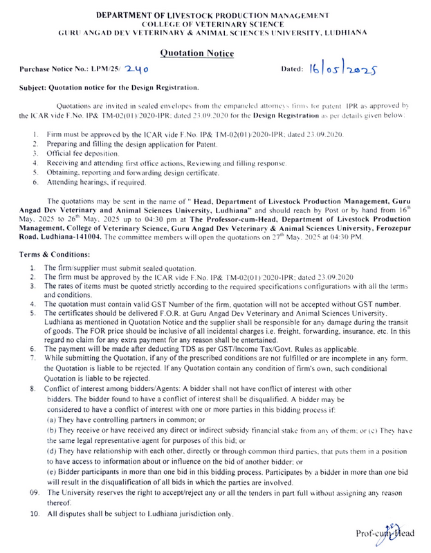 Quotation Notice for the Design Registration, Head, Department of Livestock Production Management, Guru Angad Dev Veterinary and Animal Sciences University, Ludhiana