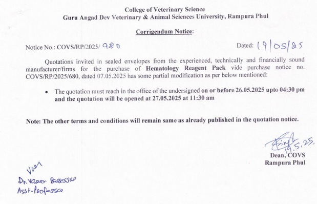 Corrigendum of tender notice no. COVS/RP/2025/680, dated 07.05.2025, Dean, College of Veterinary Science, Guru Angad Dev Veterinary & Animal Sciences University, Rampura Phul