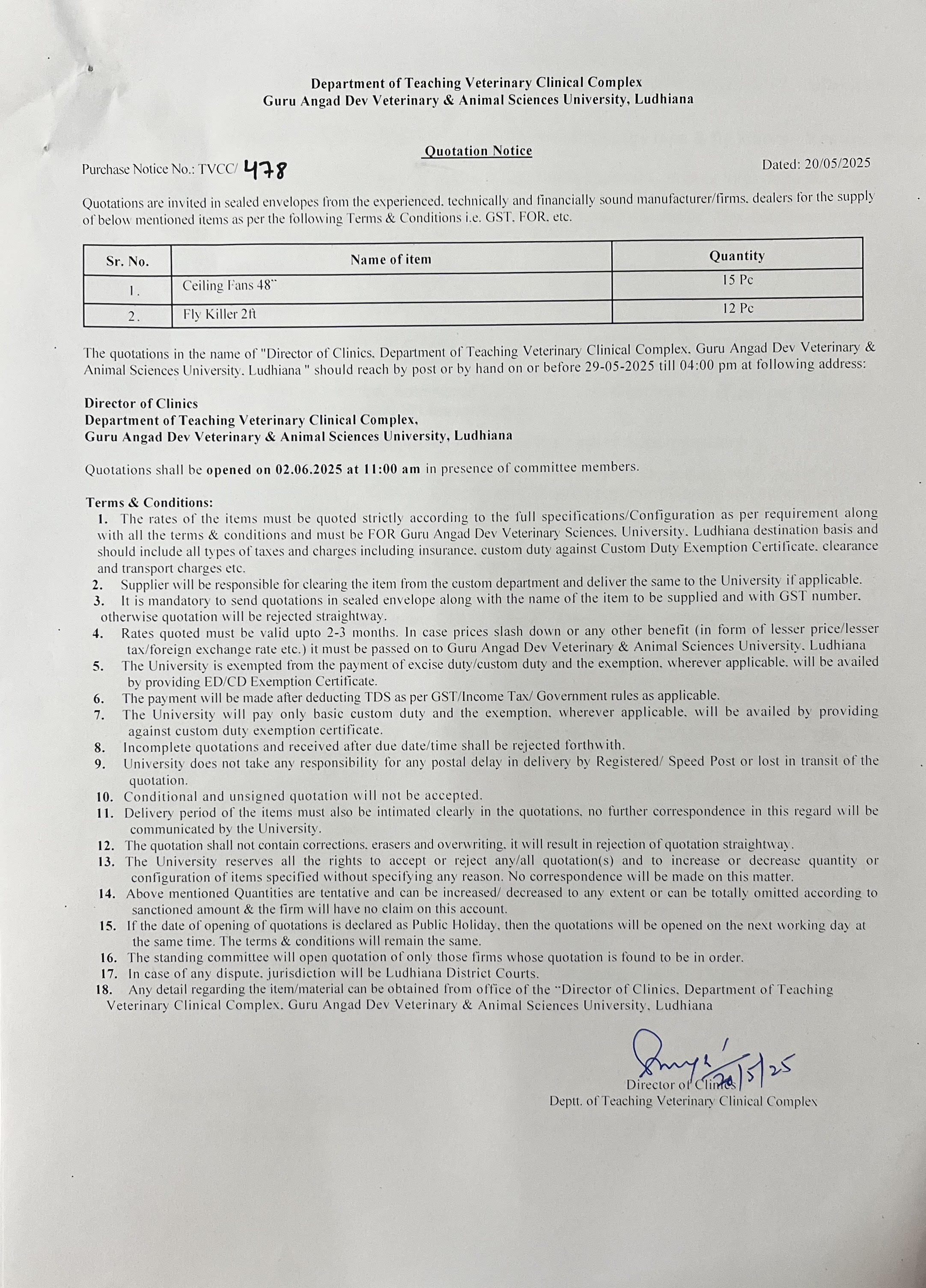Quotation Notice for Ceiling Fans 48, Fly Killer 2ft, Director of Clinics, Department of Teaching Veterinary Clinical Complex, GADVASU, Ludhiana