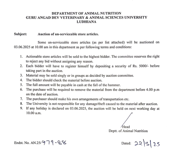 Auction of Un-serviceable Store Articles, Head, Department of Animal Nutrition, Guru Angad Dev Veterinary and Animal Sciences University, Ludhiana
