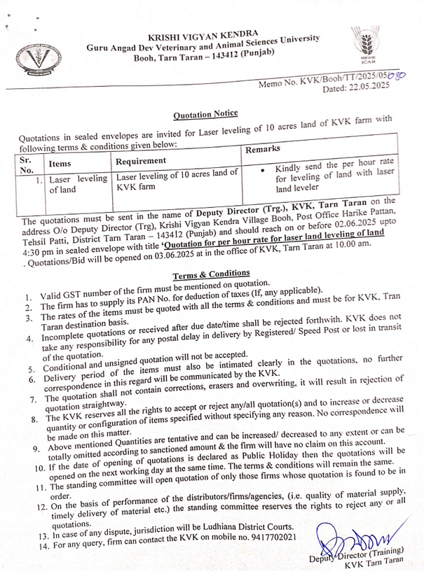 Quotation for per hour rate for laser land leveling of land, Krishi Vigyan Kendra, Booh, Tarn Taran, Guru Angad Dev Veterinary and Animal Sciences University, Ludhiana