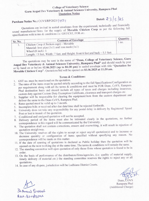 Quotation Notice for the supply of Movable Chicken Coop, Dean, College of Veterinary Science, Guru Angad Dev Veterinary & Animal Sciences University, Rampura Phul