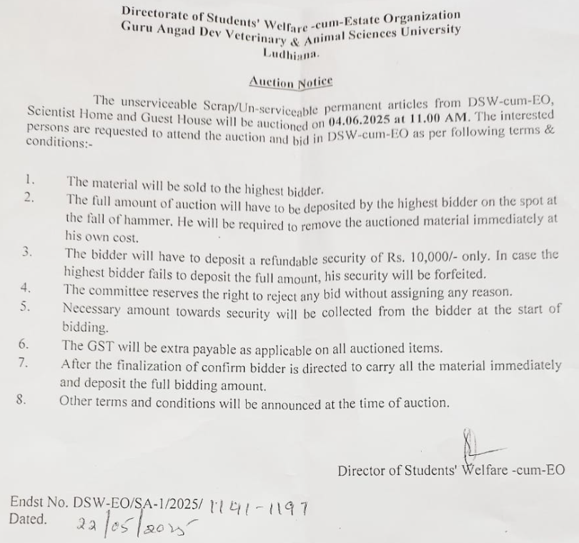 Auction notice for unserviceable Scrap/Un-serviceable permanent articles, DSW-cum-EO, Guru Angad Dev Veterinary and Animal Sciences University, Ludhiana