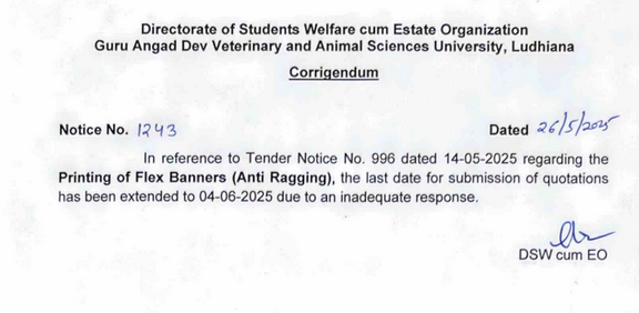 Corrigendum in reference to Tender Notice No. 996 dated 14-05-2025 regarding Printing of Flex Banners (Anti Ragging), DSW-cum-EO, Guru Angad Dev Veterinary and Animal Sciences University, Ludhiana