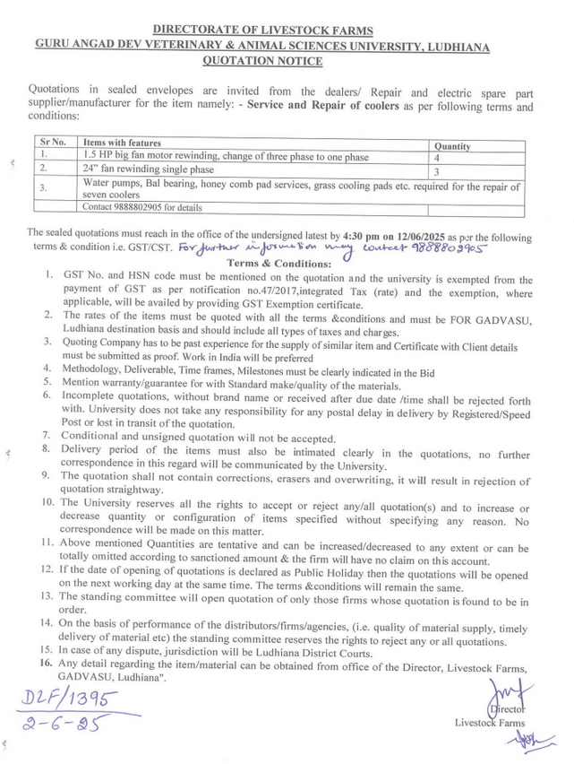 Quotation notice for the Service and Repair of Coolers, Director, Livestock Farms, Guru Angad Dev Veterinary and Animal Sciences University, Ludhiana