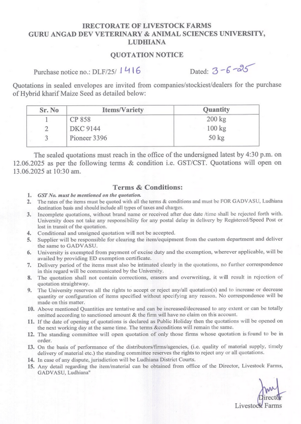 Quotation notice for the purchase of Hybrid Kharif Maize Seed, Director, Livestock Farms, Guru Angad Dev Veterinary and Animal Sciences University, Ludhiana