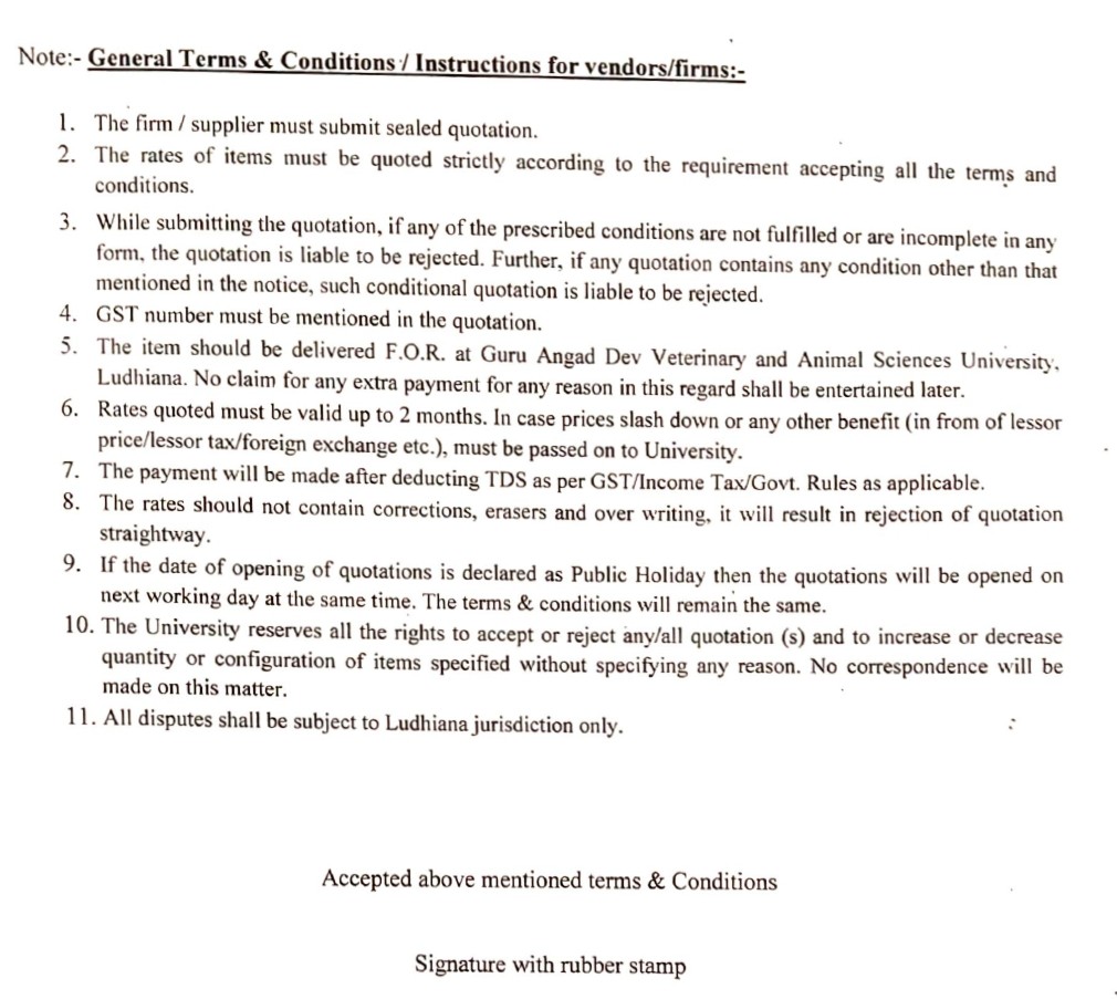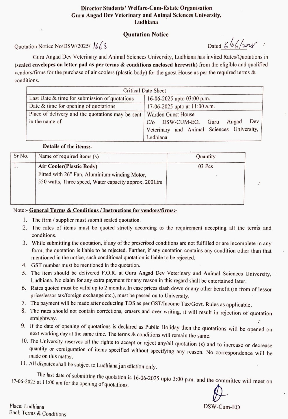 Quotation notice for the purchase of Air Coolers (plastic body), Director Students Welfare-cum-Estate Organisation, Guru Angad Dev Veterinary & Animal Sciences University, Ludhiana