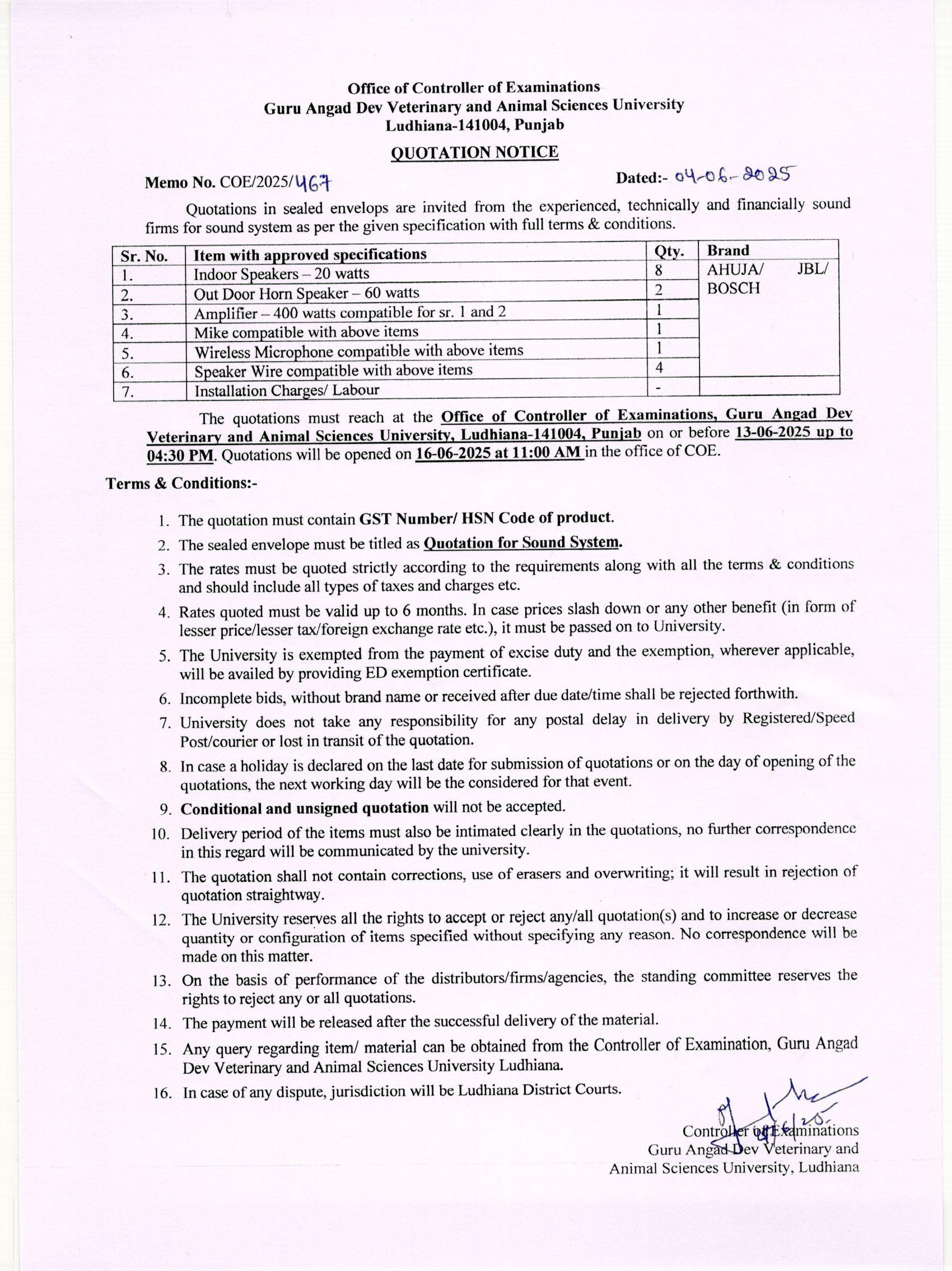Quotation Notice for the Sound System, O/o Controller of Examinations, Guru Angad Dev Veterinary and Animal Sciences University, Ludhiana