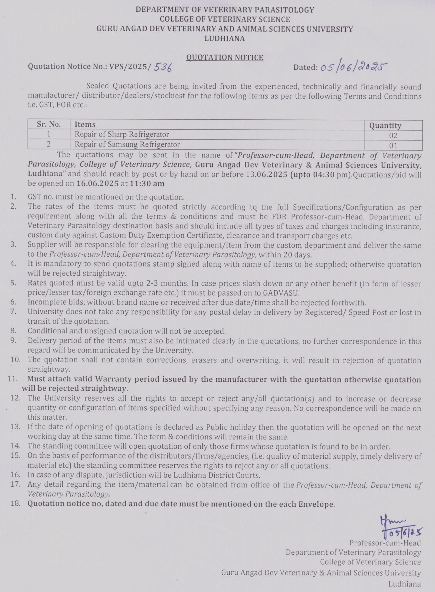 Quotation Notice for the Repair of Refrigerators, Department of Veterinary Parasitology, COVS, Guru Angad Dev Veterinary & Animal Sciences University, Ludhiana
