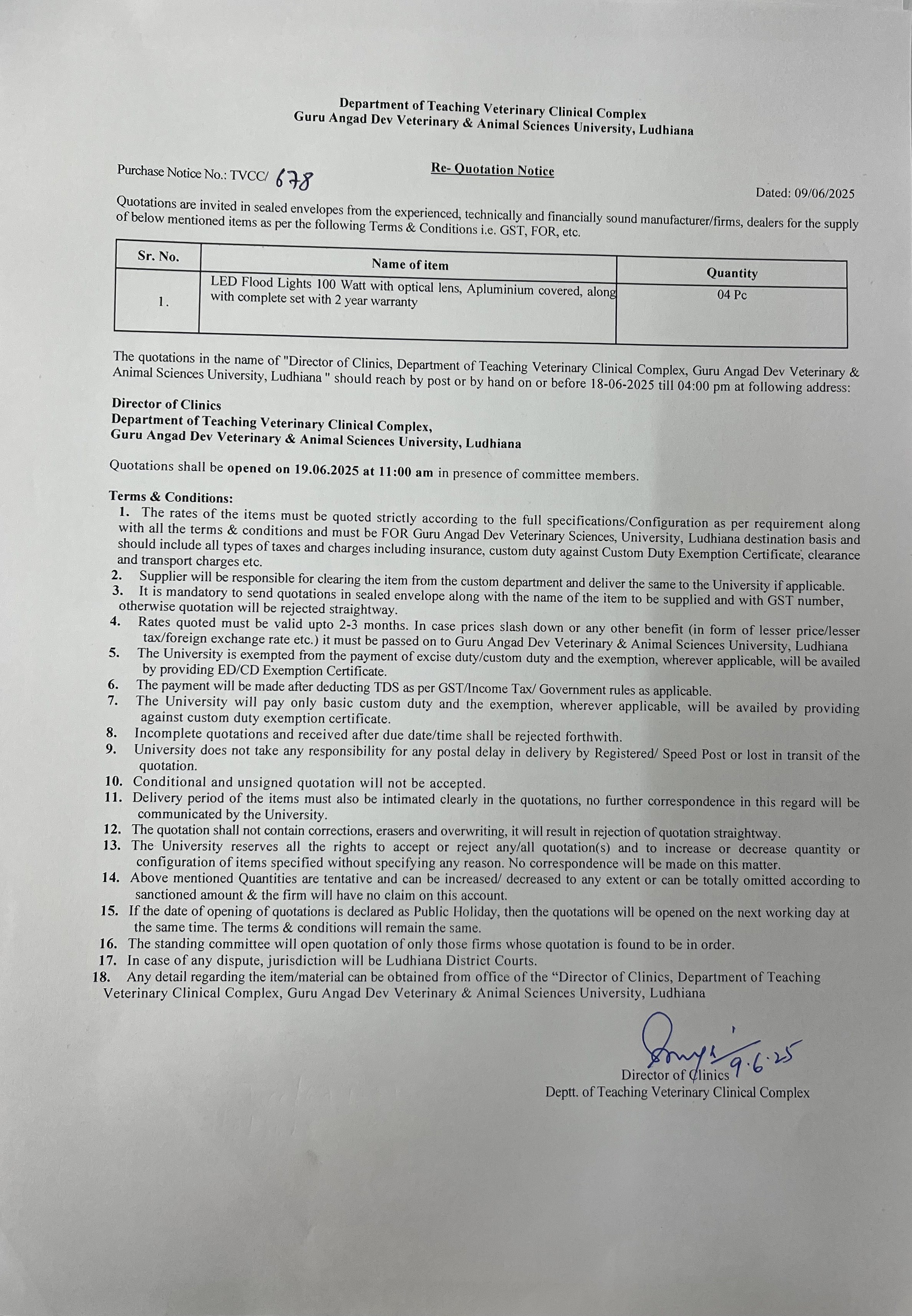 Re-Quotation notice for the purchase of LED Flood Lights 100 Watt with Optical Lens, Apluminium Covered along with Complete Set with 2 Year Warranty, Director of Clinics, Deptt. of TVCC, GADVASU, Ludh