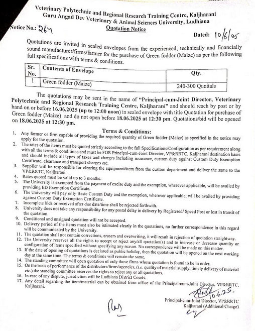 Quotation notice for the purchase of Green Fodder (Maize), Veterinary Polytechnic and Regional Research Training Centre, Kaljharani, Guru Angad Dev Veterinary & Animal Sciences University, Ludhiana