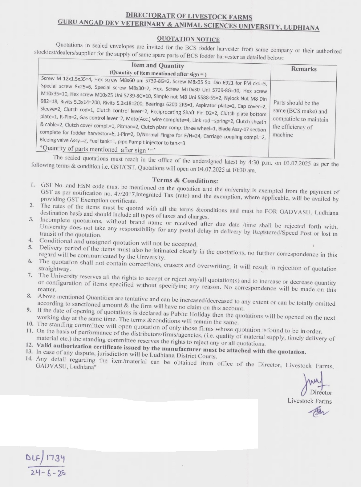 Quotation Notice for the supply of same spare parts of BCS fodder harvester, Directorate of Livestock Farms, Guru Angad Dev Veterinary & Animal Sciences University, Ludhiana