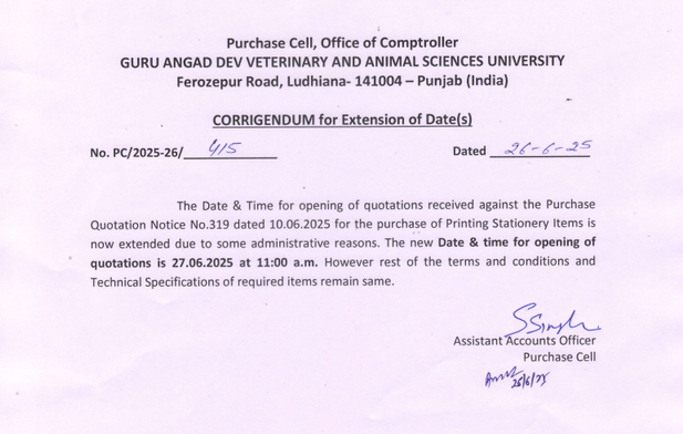 Corrigendum for extension of date(s) for purchase of Printing Stationary Items, Assistant Accounts Officers, Purchase Cell, Guru Angad Dev Veterinary & Animal Sciences University, Ludhiana
