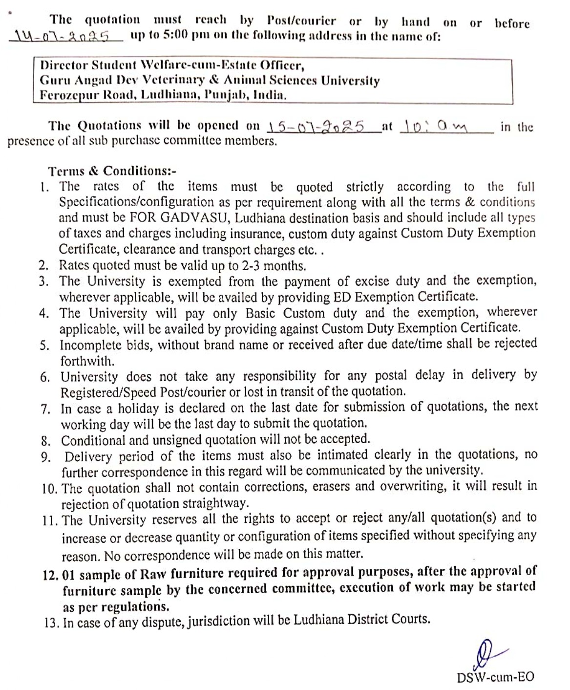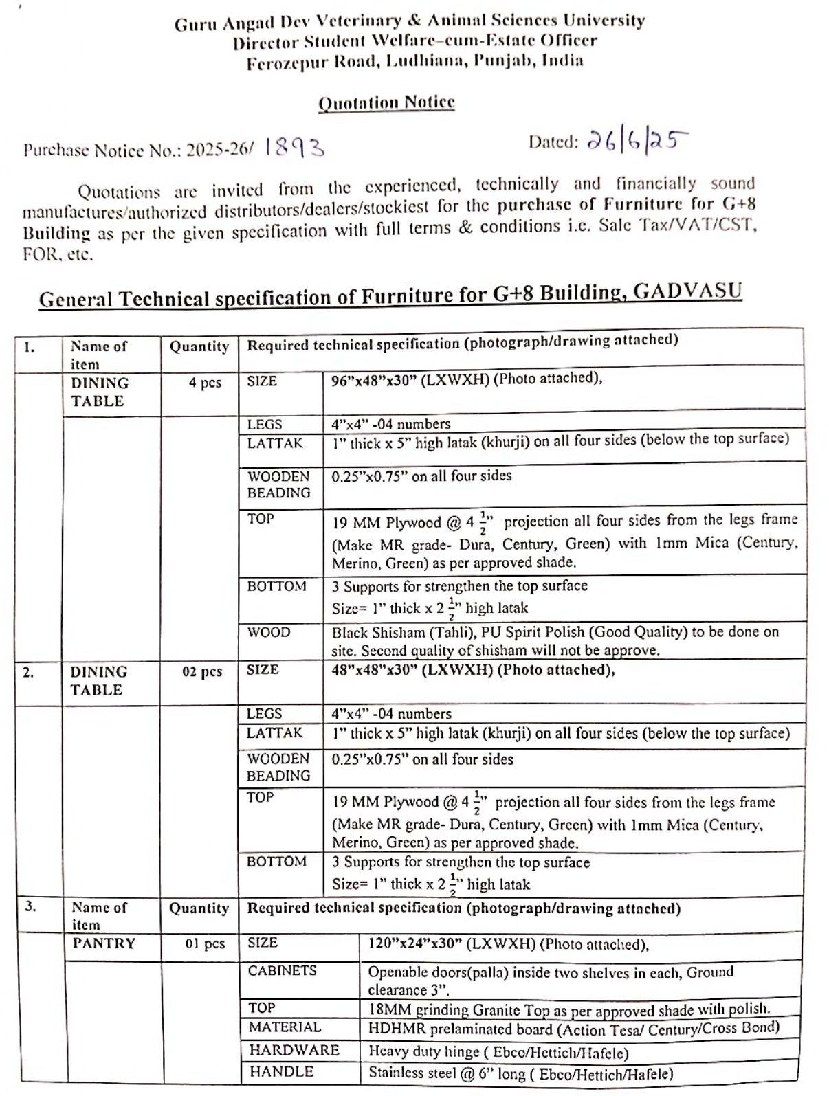 Quotation Notice for the purchase of Furniture for G+8 Building, Director Student Welfare-cum-Estate Officer, Guru Angad Dev Veterinary & Animal Sciences University, Ludhiana