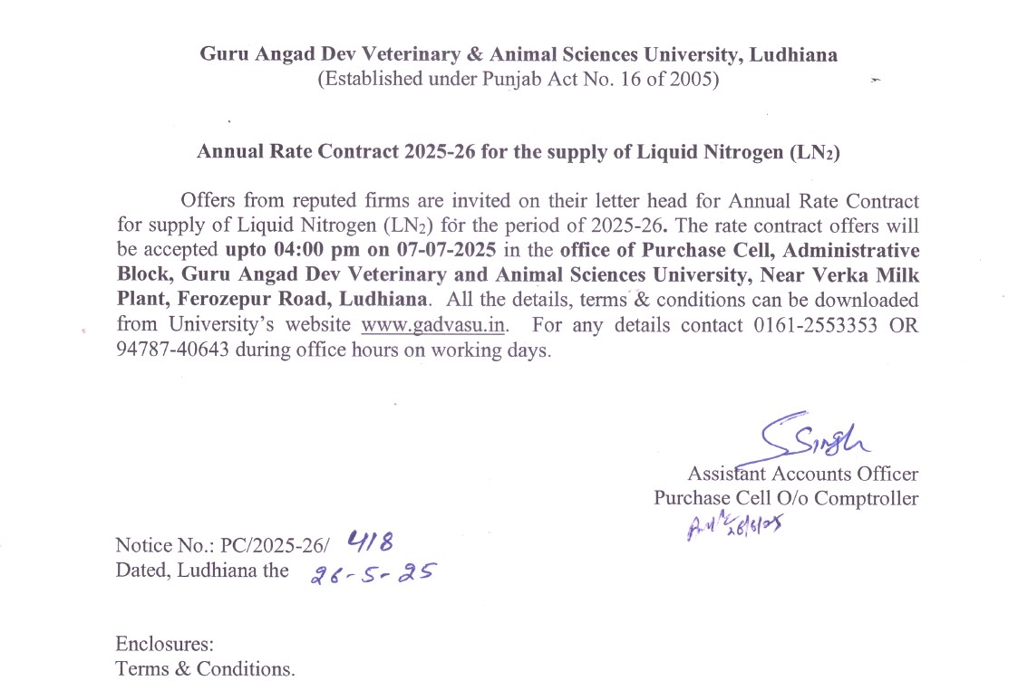 Quotation Notice for the Annual Rate Contract 2025-26 for the supply of Liquid Nitrogen (LN2), Assistant Accounts Officer, Purchase Cell, O/o Comptroller, GADVASU, Ludhiana