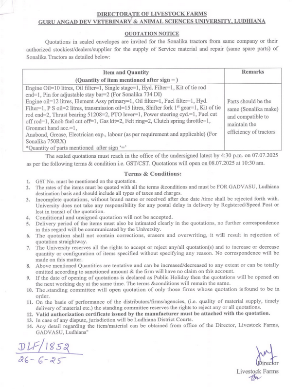 Quotation Notice for the supply of Service Material and repair of Sonalika Tractors, Director, Livestock Farms, Guru Angad Dev Veterinary & Animal Sciences University, Ludhiana