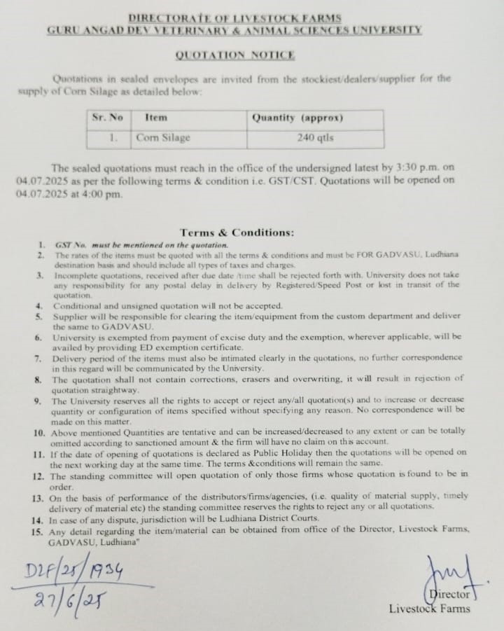 Quotation notice for the supply of Corn Silage, Directorate of Livestock Farms, Guru Angad Dev Veterinary & Animal Sciences University, Ludhiana