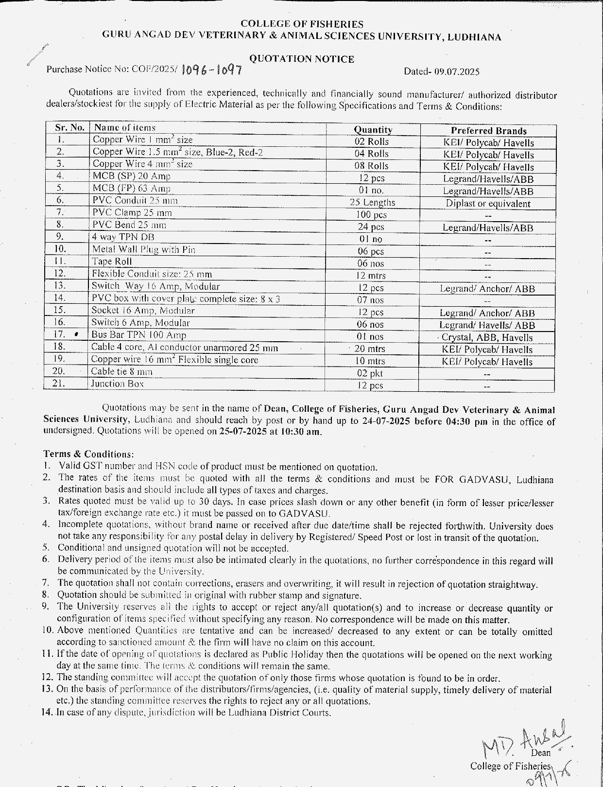 Quotation Notice for the supply of Electrical Material, Dean, College of Fisheries, Guru Angad Dev Veterinary & Animal Sciences University, Ludhiana