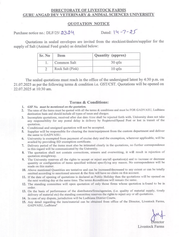 Quotation notice for the supply of Salt (Animal Feed Grade), Director, Livestock Farms, Guru Angad Dev Veterinary and Animal Sciences University, Ludhiana