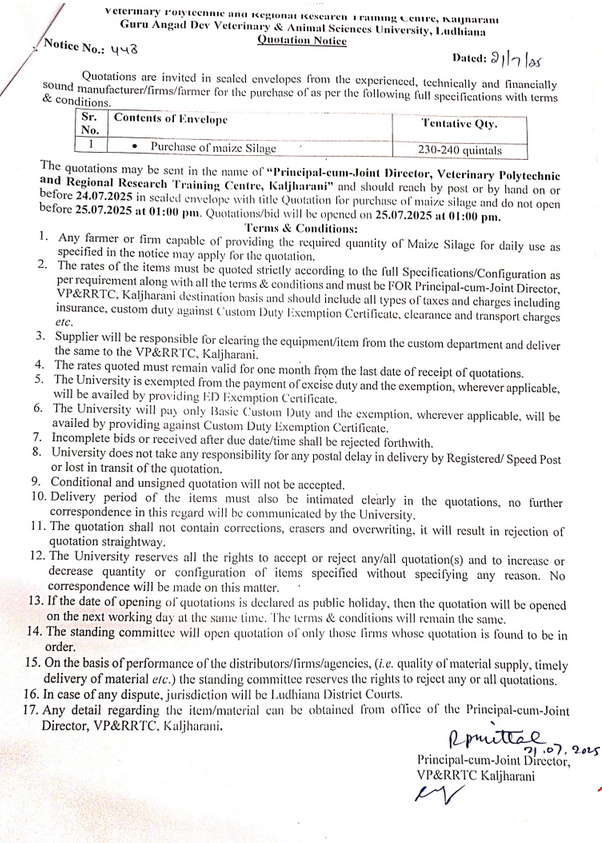 Quotation notice for the purchase of Maize Silage, Principal-cum-Joint Director, VP&RRTC, Kaljharani, GADVASU, Ludhiana