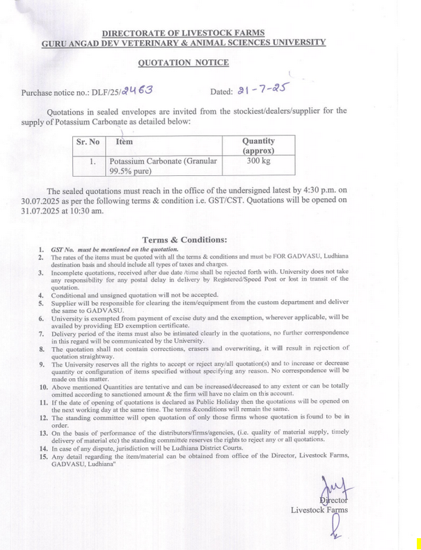 Quotation notice for the supply of Potassium Carbonate, Director, Livestock Farms, Guru Angad Dev Veterinary and Animal Sciences University, Ludhiana