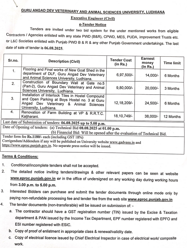e-Tender Notice for various Civil Works, Executive Engineer (Civil), Guru Angad Dev Veterinary and Animal Sciences University, Ludhiana