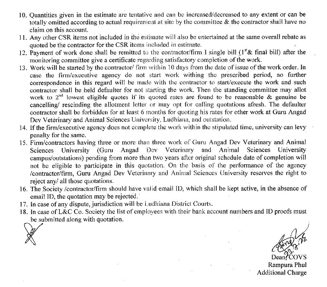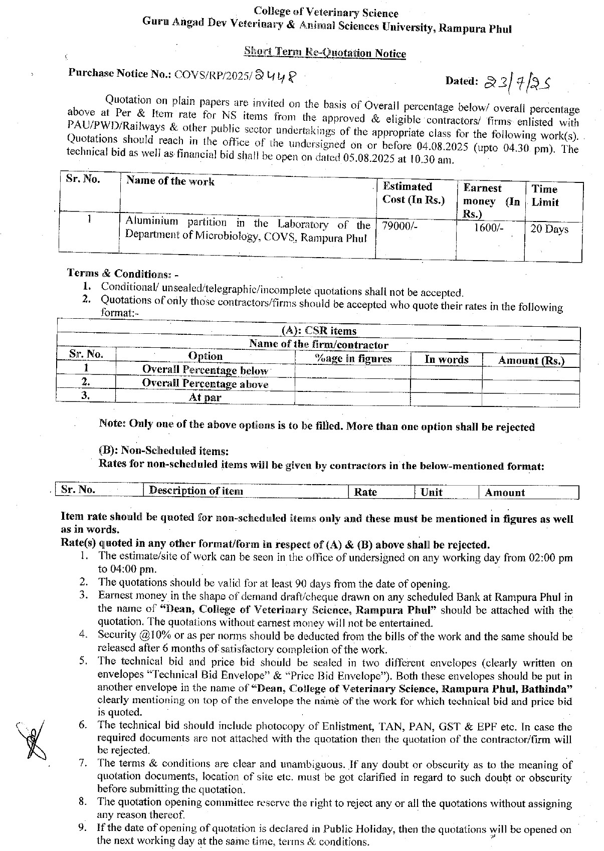 Short term Re-Quotation Notice for the Aluminium partition in the Laboratory, Dean, COVS, Guru Angad Dev Veterinary & Animal Sciences University, Rampura Phul
