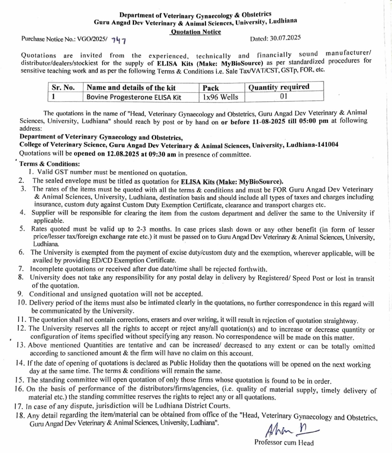 Quotation notice for the supply of ELISA Kits (Make: MyBioSource), Department of Veterinary Gynaecology and Obstetrics, Guru Angad Dev Veterinary & Animal Sciences University, Ludhiana