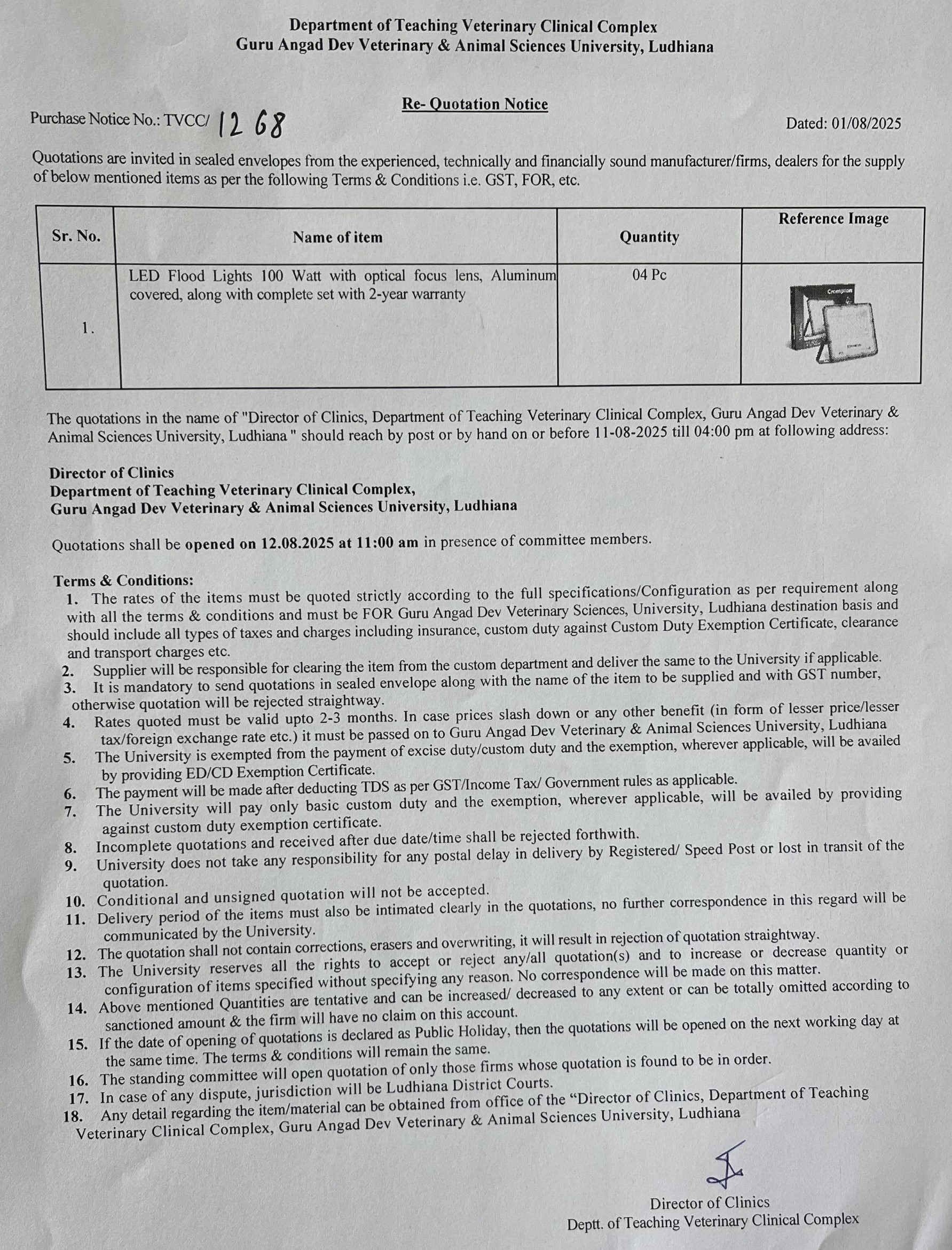 Quotation notice for the purchase of LED Flood Lights, Dept. of Teaching Veterinary Clinical Complex, Ludhiana