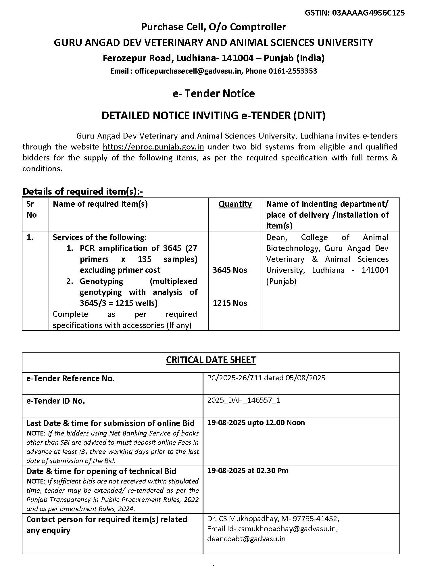 e-Tender for Services of PCR amplification of 3645, Assistant Accounts Officers, O/o Comptroller, Guru Angad Dev Veterinary & Animal Sciences University, Ludhiana