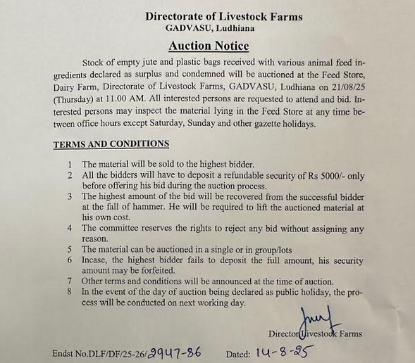 Auction Notice for Stock of Empty Jute and Plastic Bags received with various animal feed ingredients, Directorate of Livestock Farms, Guru Angad Dev Veterinary & Animal Sciences University, Ludhiana
