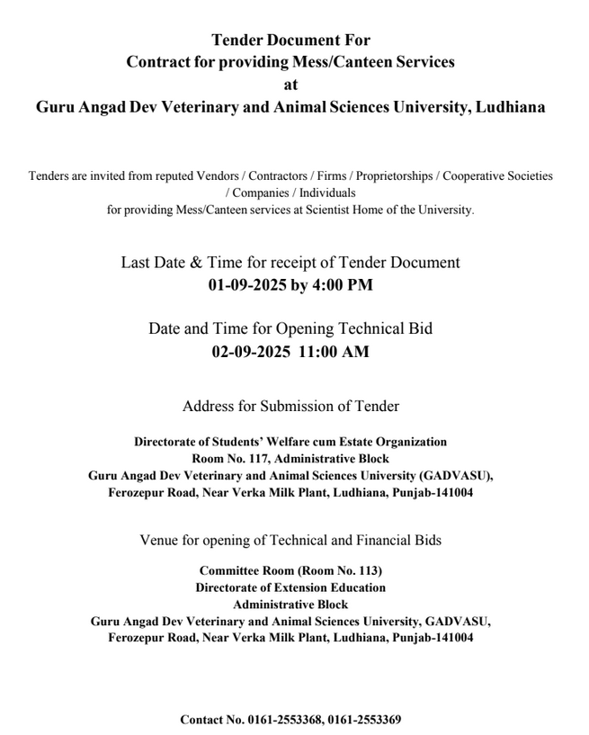 Tender Notice for providing Mess/Canteen services at University, Guru Angad Dev Veterinary and Animal Sciences University, Ludhiana
