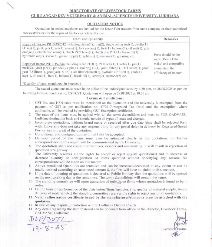 Quotation notice for repair of Tractors, Director, Livestock Farms, Guru Angad Dev Veterinary and Animal Sciences University, Ludhiana