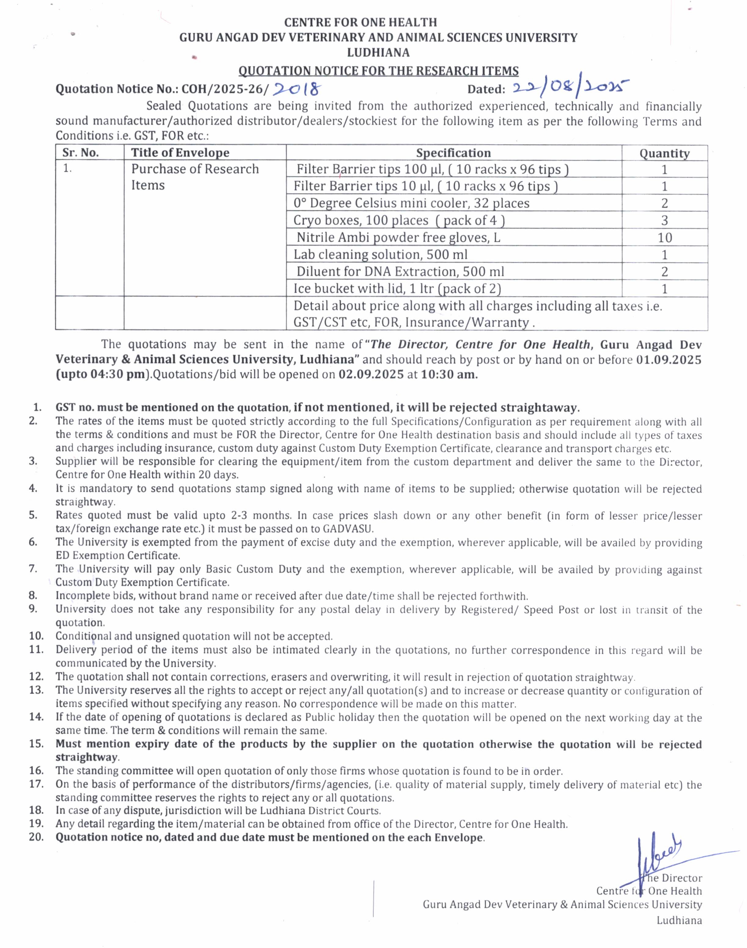 Quotation Notice for Purchase of Research Items, The Director, Centre for One Health, Guru Angad Dev Veterinary & Animal Sciences University, Ludhiana