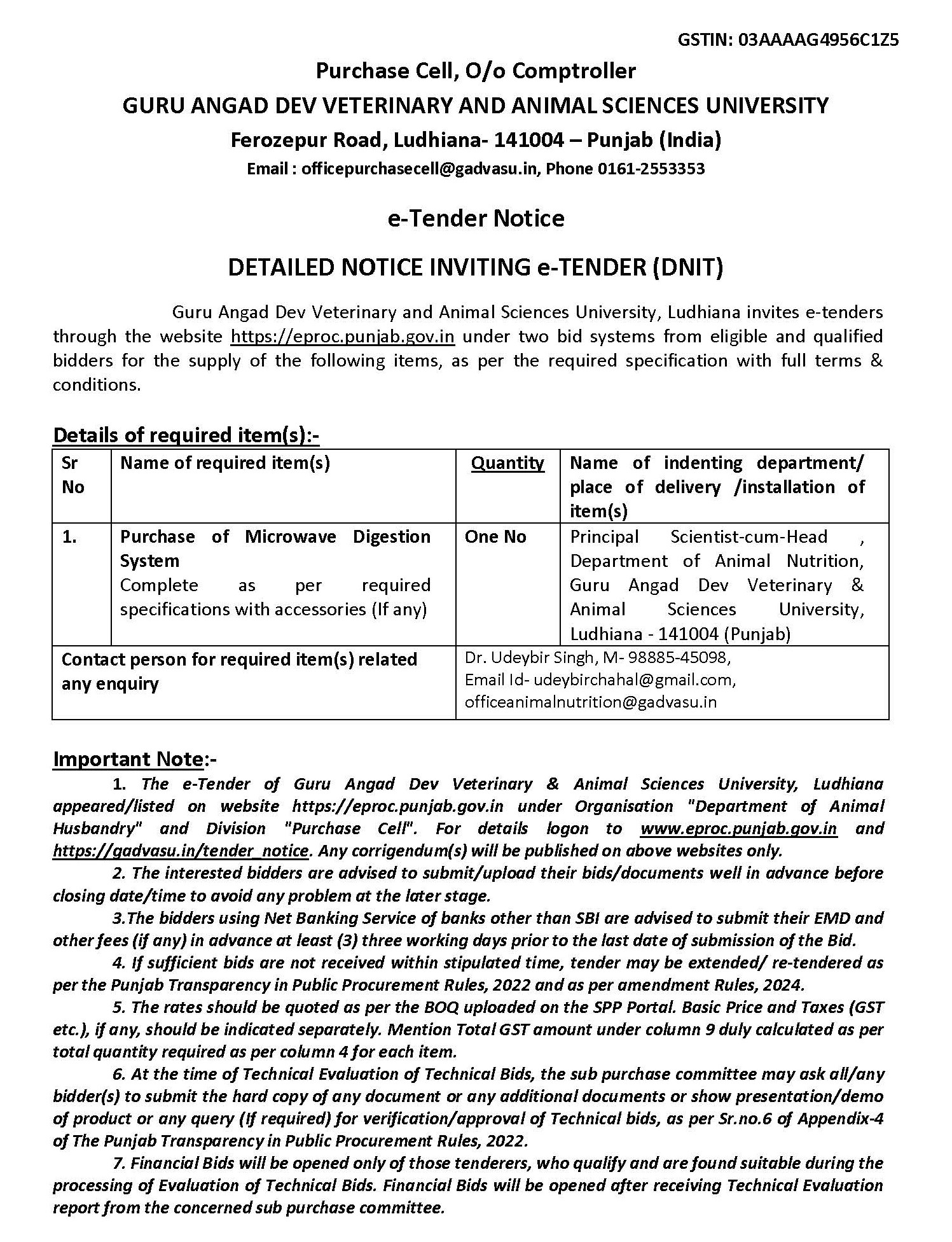 e-Tender Notice for the Purchase of Microwave Digestion System, Assistant Store Officer, Purchase Cell, O/o Comptroller, Guru Angad Dev Veterinary and Animal Sciences University, Ludhiana