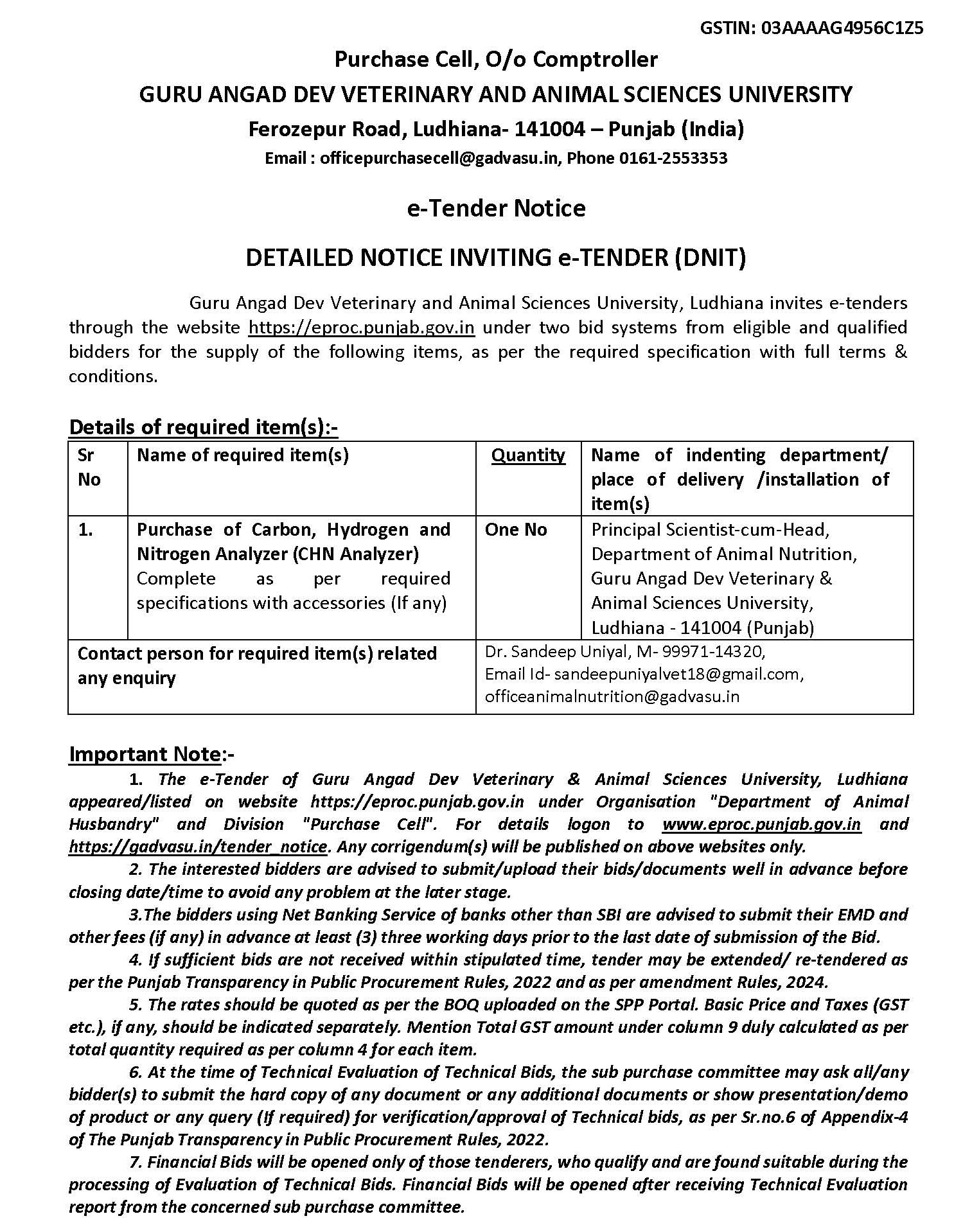 e-Tender Notice for the Purchase of carbon, Hydrogen and Nitrogen Analyzer (CHN Analyzer), Assistant Store Officer, Purchase Cell, O/o Comptroller, GADVASU, Ludhiana