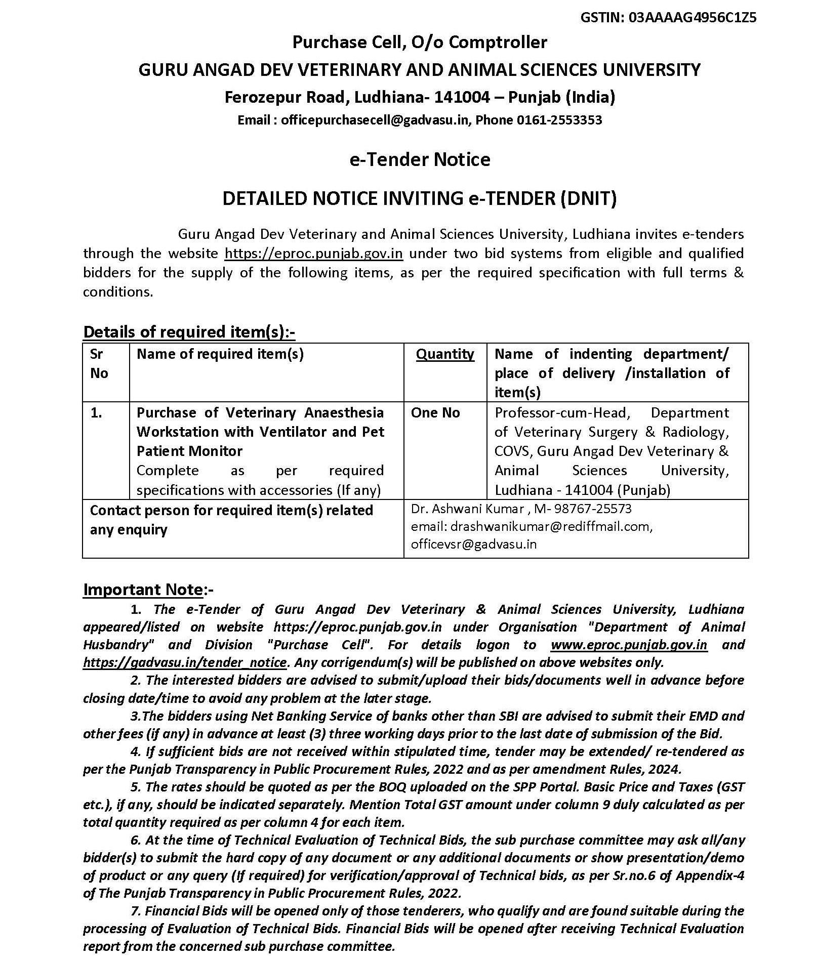 CLICK HERE TO VIEW MORE DETAILS FOR E-TENDER FOR PURCHASE OF VETERINARY ANESTHESIA WORKSTATION WITH VENTILATOR AND PET PETIENT MONITER