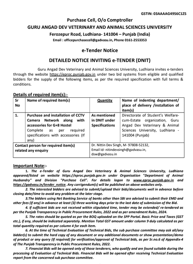 e-Tender notice for the Purchase and installation of CCTV Camera Network along with accessories for G+8 Hostel, Assistant Store Officer, Purchase Cell, O/o Comptroller, GADVASU, Ludhiana
