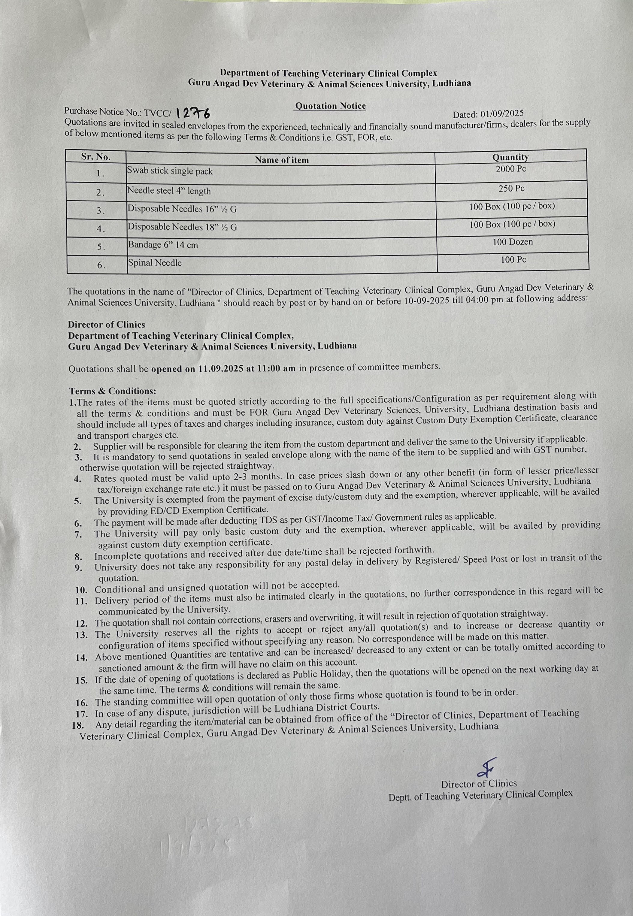 Quotation Notice for the supply of swab Stick, Needle steel, disposable needles, Bandage, Spinal Needle, Director of Clinics, Department of Teaching Veterinary Clinical Complex, GADVASU, Ldh