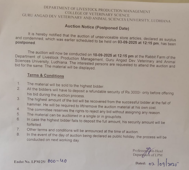 Auction Notice (Postponed Date) for the auction of unserviceable store articles, Department of Livestock Production Management, COVS, Guru Angad Dev Veterinary and Animal Sciences University, Ludhiana