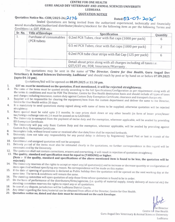 Quotation Notice for the purchase of consumable (PCR Tubes), Director, Centre for One Health, Guru Angad Dev Veterinary & Animal Sciences University, Ludhiana
