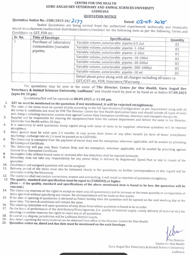 Quotation Notice for the purchase of Laboratory consumable (variable pipette), Director, Centre for One Health, Guru Angad Dev Veterinary & Animal Sciences University, Ludhiana