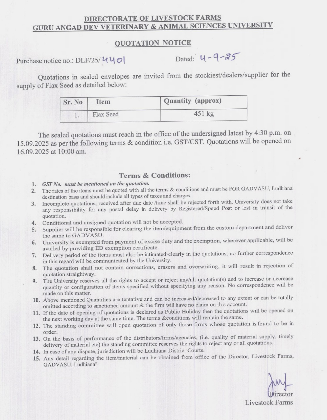 Quotation Notice for the supply of Flax Seed, Director, Livestock Farms, Guru Angad Dev Veterinary & Animal Sciences University, Ludhiana