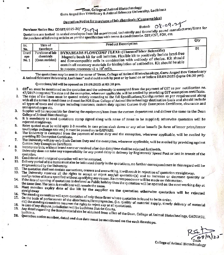 Quotation Notice for purchase of Lab Chemicals, Dean, College of Animal Biotechnology, Guru Angad Dev Veterinary & Animal Sciences University, Ludhiana