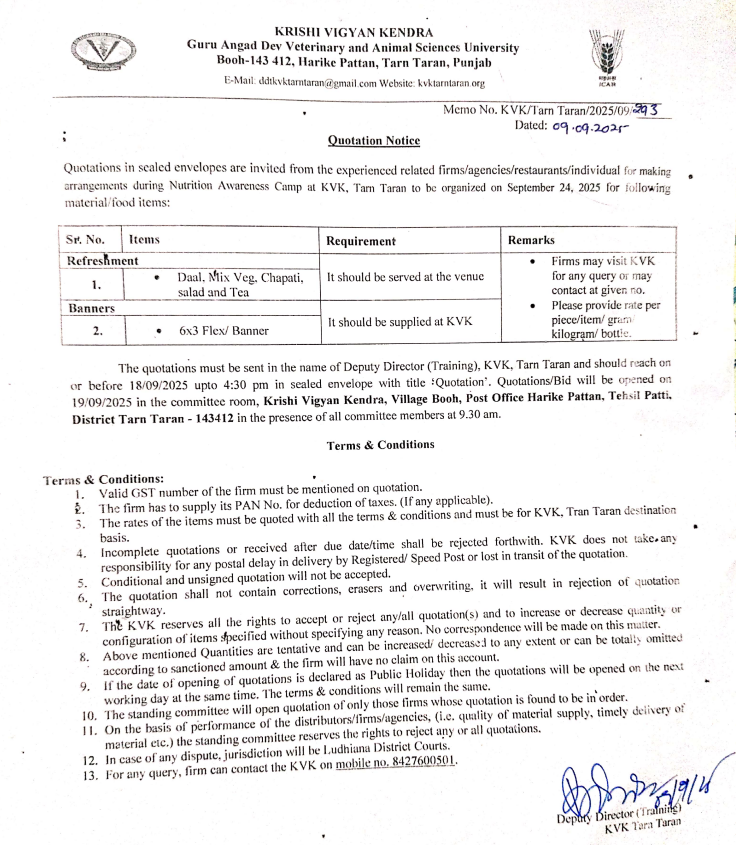 Quotation Notice for Refreshment, Banners, Krishi Vigyan Kendra, GADVASU, Booh-143 412, Harike Pattan, Tarn Taran, Punjab