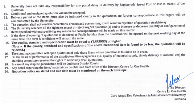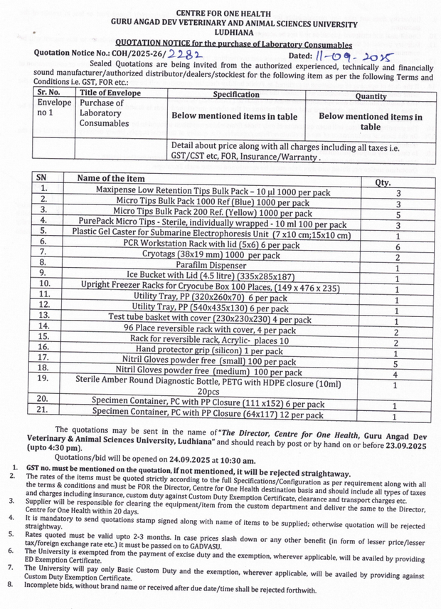 Quotation Notice for the purchase of Laboratory consumable, Director, Centre for One Health, Guru Angad Dev Veterinary & Animal Sciences University, Ludhiana