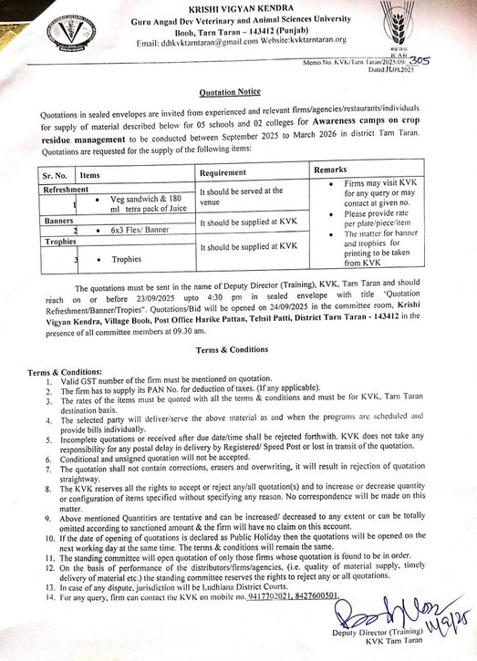 Quotation Notice for Veg Sandwich, Banners, Trophies, Krishi Vigyan Kendra, GADVASU, Booh-143 412, Harike Pattan, Tarn Taran, Punjab
