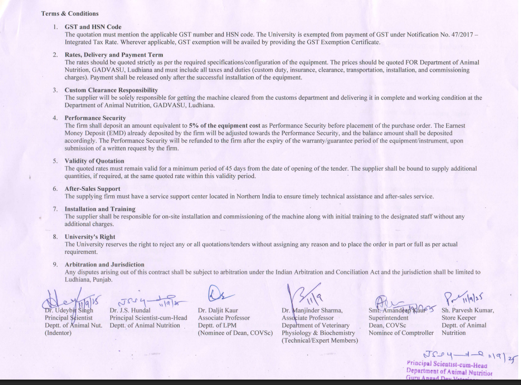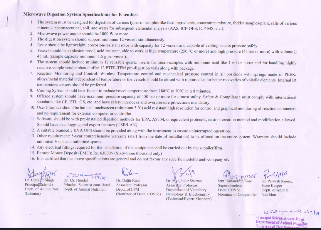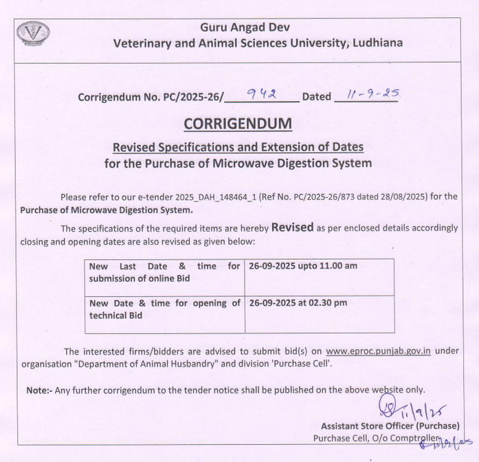Corrigendum for Revised Specifications and Extension of Dates for the Purchase of Microwave Digestion System, Assistant Store Officer, Purchase Cell O/o Comptroller, GADVASU, Ludhiana