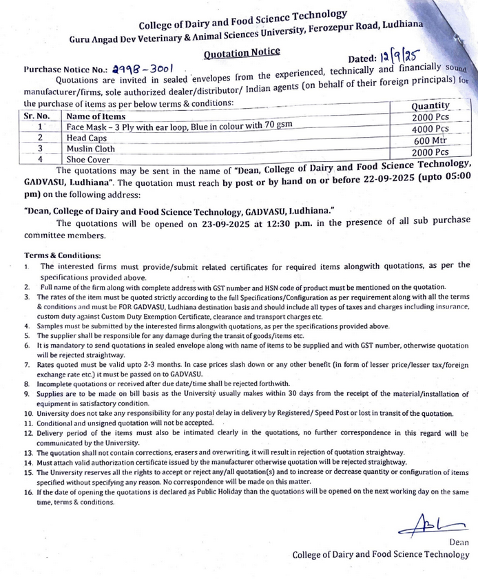 Quotation Notice for the purchase of utility items for EDP External, Dean, College of Dairy and Food Science Technology, Guru Angad Dev Veterinary & Animal Sciences University, Ludhiana